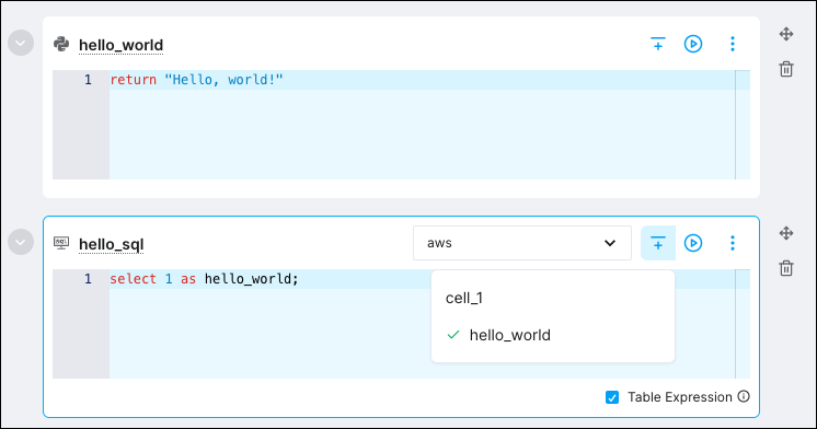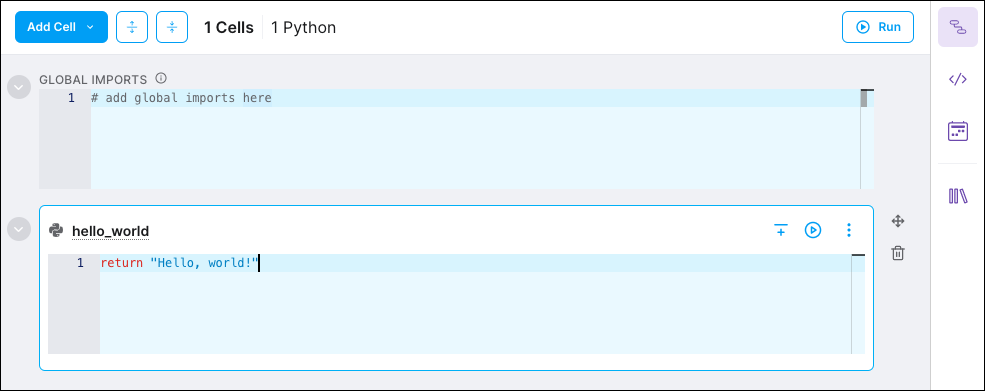 Cells are the building blocks for pipelines. They can complete a unit of work, such as a Python function or SQL query, or they can define assets for use throughout your pipeline. For this quickstart, you'll write a Python cell named hello_world.