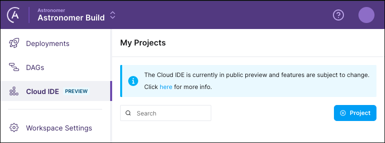 - Click Cloud IDE in the left menu. If you are the first person in your Workspace to use the Astro Cloud IDE, the Projects page is empty.