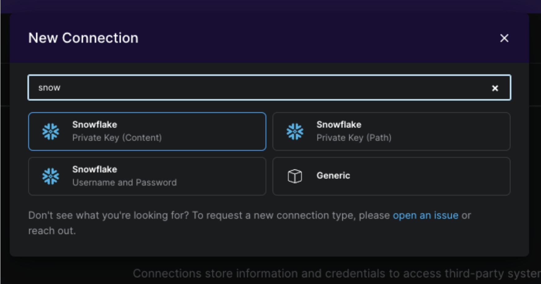 In the connection collection search for Snowflake and select Snowflake Private Key (Content).
